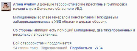 Министр внутренних дел Арсен Аваков заявляет, что в Донецке боевики штурмуют Донецкое облуправление.