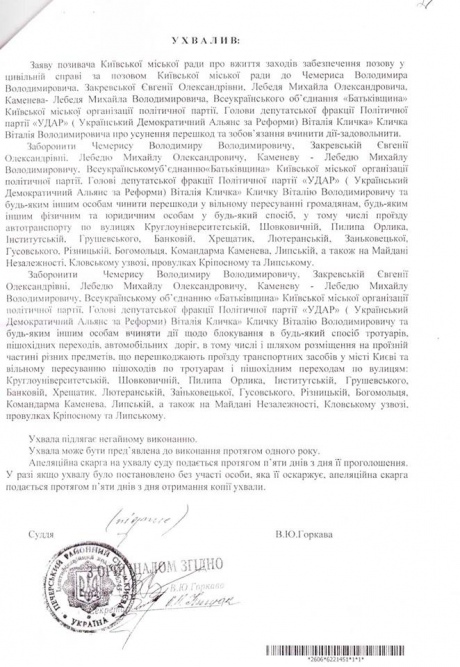 Решение о запрете проведения массовых мероприятий в центре Киева 9 декабря 2013 года приняла судья Печерского райсуда Виктория Горкавая.