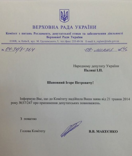 В письме от 9 июля за подписью председателя комитета Владимира Макеенко сказано, что заявление Палицы поступило в Верховную Раду.