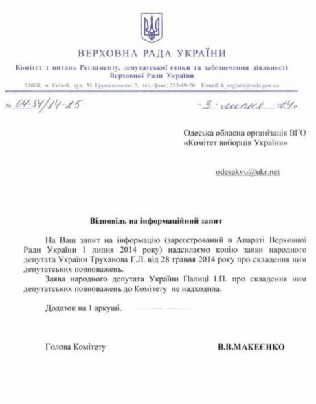 В то же время в ответе регламентного комитета на запрос одесской организации Комитета избирателей от 3 июля указывалось, что заявление от Палицы не поступало.