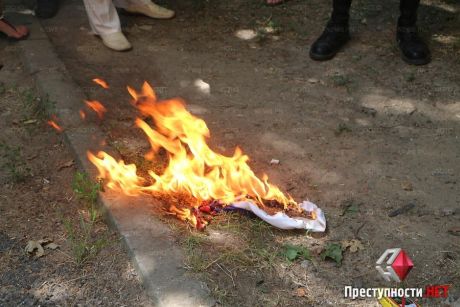 Однако их убедили дождаться следственно-оперативную группу, после приезда которой флаг разорвали пополам. Одну часть полотна отдали правоохранителями, вторую часть публично сожгли.
