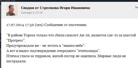 В частности, как сообщили на странице боевиков в сети Вконтакте, террористы сбили под Торезом Ан-26.