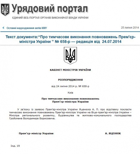 "В связи с заявлением премьер-министра Украины Яценюка А. П. об отставке возложить временно исполнение полномочий премьер-министра на вице-премьер-министра – министра регионального развития, строительства и жилищно-коммунального хозяйства Гройсмана Владимира Борисовича", - сказано в документе.