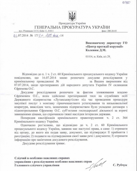Как говорится в ответе, Ефремов оказывал давление на должностных лиц Государственного предприятия "Луганскуголь" во время проведения процедуры закупки услуг по монтажу горношахтного оборудования и низковольтной аппаратуры.
