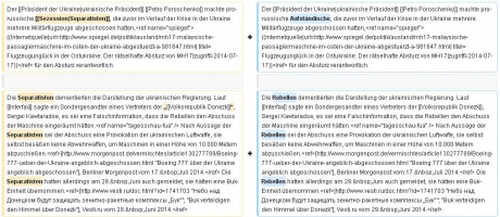 Как следует из истории правок статьи, с IP-адресов ФСО пытались изменить слова "Separatisten" ("сепаратисты") на "Rebellen", "Aufständischen" ("повстанцы"), "militärische Führung" ("военное руководство"), а "Separatistenführer" ("руководитель сепаратистов") — на "Aufständische Ministerpräsident" ("премьер-министр повстанцев").
