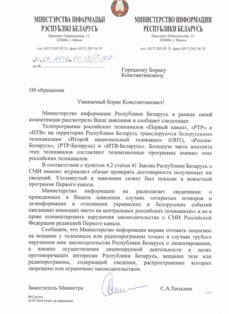 "Министерство информации не располагает сведениями о приведенных в вашем заявлении случаях "открытых оговоров и дезинформации в отношении украинских и белорусских событий, ежедневно имеющих место на центральных российских телеканалах", – написало министерство.