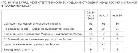 40% опрошенных рассматривают отношения между Россией и Украиной как "враждебные", 39% – "напряженные". Россияне - 85% - возлагают ответственность за ухудшение отношений между странами на власти Украины. Т