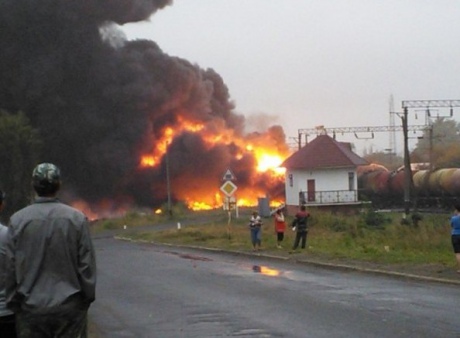 В пятницу в 06:35 на железнодорожной станции "Городище", 20 железнодорожных цистерн с нефтепродуктами и локомотив сошли с рельсов, 11 из них загорелись.