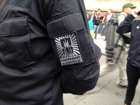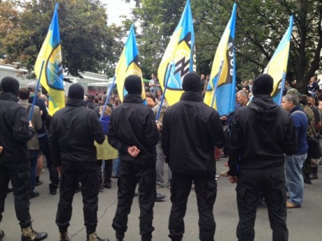 У присутствующих - флаги добровольческих батальонов "Азов", "Донбасс", а также "Правого сектора", отмечает "Радио Свобода".