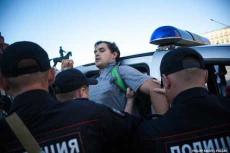 На Манежке за антивоенные призывы задержан @dmtrmon (18 июня 2013 он был избит полицией в автозаке за акцию в поддержку Навального)