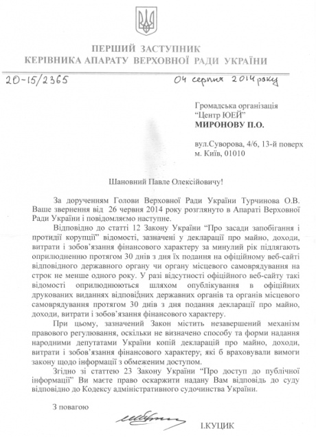 Как говорится в ответе, закон "О принципах предотвращения и противодействия коррупции" содержит "незавершенный механизм правового регулирования, поскольку не определен способ и формы предоставления народными депутатами копий деклараций о доходах, расходах и обязательствах финансового характера, которые бы учитывали требования закона по информации с ограниченным доступом".
