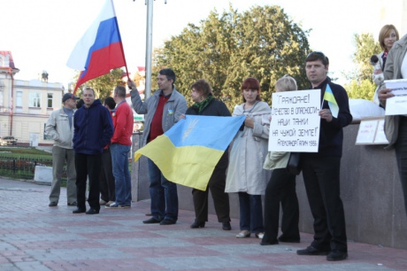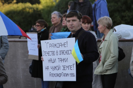 Акция собрала около 50 человек, которые стояли с плакатами "Прекратите кошмарить Украину", "Мы за мир" и др.