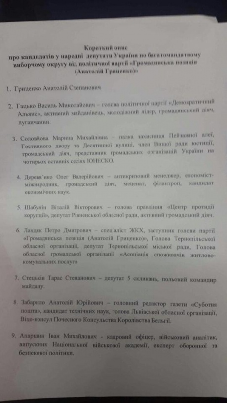 В первой десятке - заместитель лидера "Гражданской позиции" Олег Канивец и журналистка, член "ДемАльянса" Наталья Соколенко (в "рабочем варианте" списка указан Виктор Андрусив).