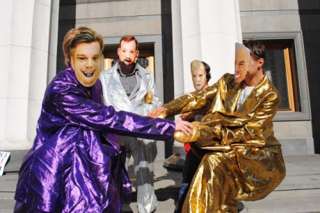 Активисты в масках Виктора и Александра Януковичей, Пшонки, Азарова и других "поблагодарили народных депутатов за то, что те до сих пор не приняли законопроект, которым учреждается антикоррупционное Бюро".
