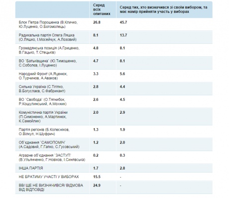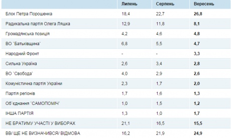 Согласно опросу, Блок Петра Порошенко получает 26,8% от всех опрошенных и 45,7% от тех, кто определился с выбором и примет участие в голосовании, радикальная Партия Олега Ляшко набирает 8,1% и 13,7% - соответственно.