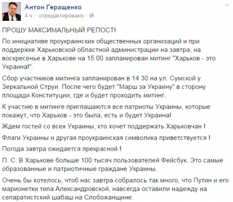 В воскресенье в Харькове состоится шествие под лозунгом "Харьков - это Украина".