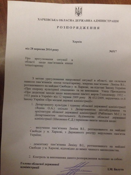 Губернатор Харьковской области Игорь Балута подписал распоряжение об официальном демонтаже памятника Ленина на пл. Свободы в Харькове.