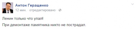 Позже Геращенко в своем Фейсбук отметил: "Ленин только что упал. Во время демонтажа никто не пострадал".