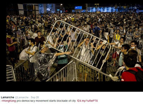 Десятки тысяч протестующих сторонников демократии строят баррикады улицах Гонконга во вторник.
