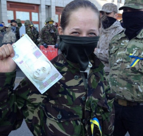Сторонникам экс-регионалов активисты раздавали ненастоящие сто гривен с изображением Нестора Шуфрича с поврежденным глазом после столкновения нардепа с активистами "Правого сектора" 30 октября в Одессе.