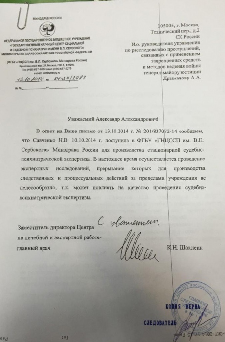 Следствие заявляет, что Савченко не может быть доставлена. 10 октября она была направлена в институт им.Сербского.