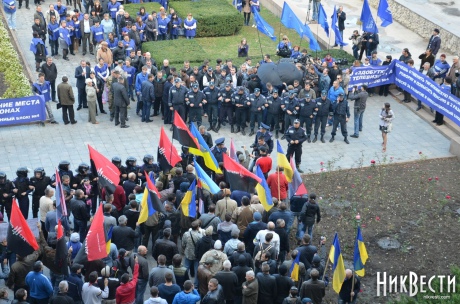 Напротив митингующих находятся активисты организаций "Правый сектор" и "Народное ополчение Николаевщины", которые выстроились у ступенек административного здания и не намерены пропускать своих политических оппонентов внутрь.