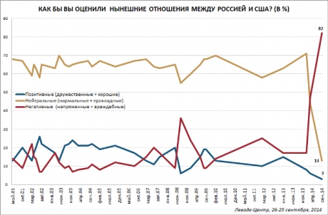 С начала года число россиян, оценивающих отношения между США и Россией как враждебные, выросло с 4% в январе до 39% в сентябре, а 43% считают их напряженными.