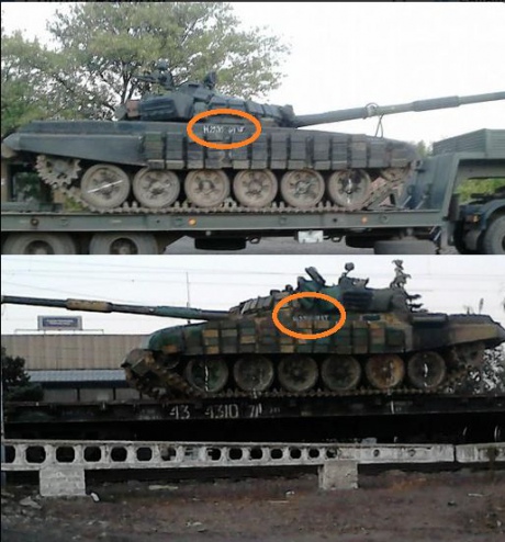 На снимках показано танки с маркировкой Российской железной дороги, сделанной в Ростове (РФ), а рядом – такая же маркировка на танках, замеченных в Донецке в октябре и 10 ноября.