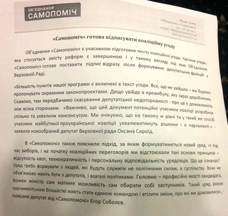"Часть соглашения, касающаяся содержания реформ, готова и в таком виде под ней Объединение "Самопомич" готово поставить подпись сразу после формирования депутатских фракций в Верховной Раде", – говорится в документе.