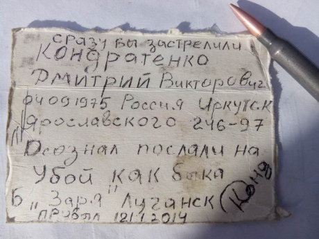 "Сразу бы застрелили. Кондратенко Дмитрий Викторович. 04.09.1975. Россия, Иркутск, Ярославского, 246 – 97. Осознал — послали на убой как быка. Б(атальон) "Заря", Луганск. Прибыл 12.11.2014." – говорится в записке.