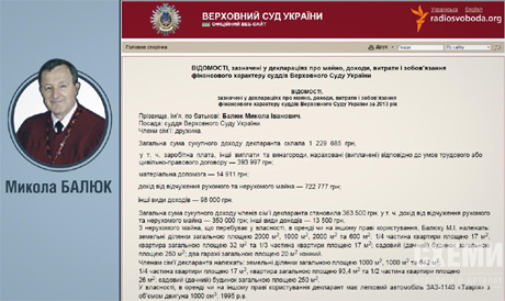 Судья Николай Балюк за 2013 год задекларировал 1 229 685 гривен доходов. Из них заработная плата – более 393 тысячи, еще почти 15 - материальной помощи. Но самый большой доход у судьи от продажи имущества, что составило более 722 тысячи гривен.
