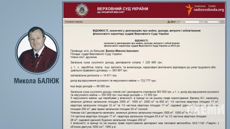 В частности, судья Николай Балюк за 2013 задекларировал 1 229 685 гривен доходов. Из них заработная плата - более 393 000, еще почти 15 - материальной помощи. Но наибольший доход у судьи от продажи имущества, составил более 722 000 гривен.