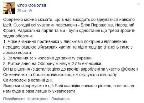 В то же время один из переговорщиков от "Самопомощи" Егор Соболев заявил: "Осторожно можно сказать, что у нас получается объединяться вокруг идей".