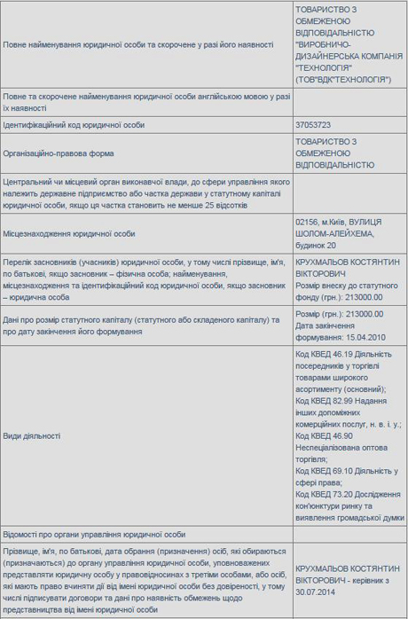 Согласно информации в Едином государственном реестре, ООО "ПДК "Технология" зарегистрирована в Киеве и занимается посредничеством в торговле товарами, предоставление других вспомогательных коммерческих услуг, оптовой торговлей и деятельностью в сфере права.