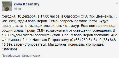 "10 декабря в 17 часов в Одесской ОГА (пр. Шевченко, 4, каб. 531), ждем волонтеров. Тема - вопрос безопасности. Будут присутствовать руководители силовых структур", - сообщила она.