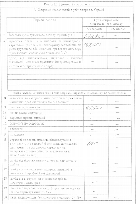 Согласно данным, с общей сумму совокупного дохода дивиденды составляли 85521 гривен, страховые выплаты – 695 гривен.