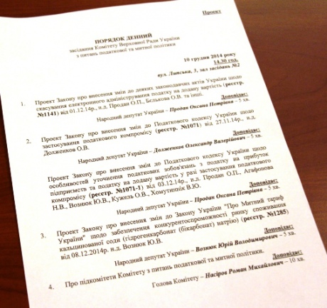 | Повестка дня комитета по вопросам налоговой и таможенной политики. Фото Сергея Андрушко |
