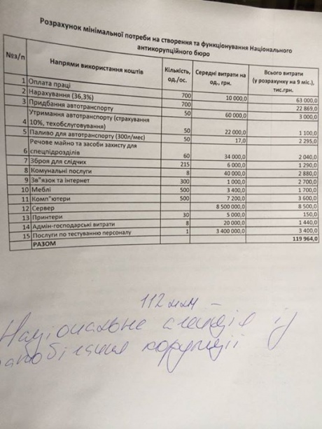 Он опубликовал документ, согласно которому на Национальное антикоррупционное бюро нужно предусмотрел почти 120 миллионов гривен, а на Национальное агентство по предотвращению коррупции – 112 миллионов гривен.