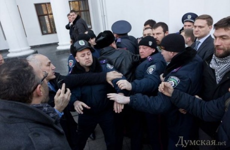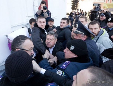 В Одессе митингующие пытались запихнуть в мусорник депутатов