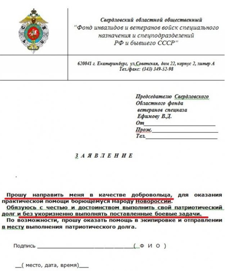 По его словам, добровольцы пишут ему заявление: "Прошу оказать поддержку в направлении меня для оказания помощи борющемуся народу Новороссии".