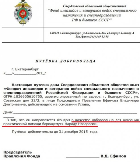"Вместе с заявлением человек заполняет анкету с данными – кто он, откуда, где служил, какой боевой опыт… После рассмотрения заявки проводим собеседование. Если человек нам подходит по боевым качествам, я включаю его в состав группы на отправку. Всем таким людям выдаём "путёвку добровольца". Именно добровольца, а не ополченца. Это официальная бумага с печатью фонда, чтобы нам не привязали потом наёмничество", - сказал он.