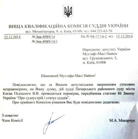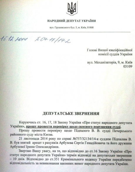 Высшая квалификационная комиссия судей начала проверку правомерности решения судьи Печерского райсуда Киева Вячеслава Пидпалого о снятии ареста со счетов Сергея и Ирины Арбузовых.