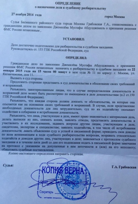 Басманный райсуд Москвы 22 января 2015 года в 15:00 рассмотрит заявление гражданина Украины Мустафы Джемилева о незаконности решения Федеральной миграционной службы РФ.
