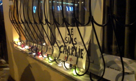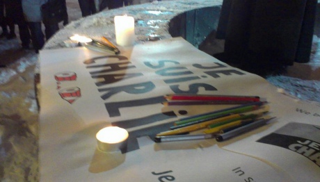 Участникам акции раздавали таблички с надписью "Je suis Charlie", активисты зажгли свечи.