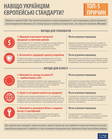 Как объясняет координатор информационной кампании "Сильнее вместе!" Любовь Акуленко, "это - третий и последний основополагающий закон, необходимый для устранения барьеров для торговли промышленными товарами между Украиной и ЕС".