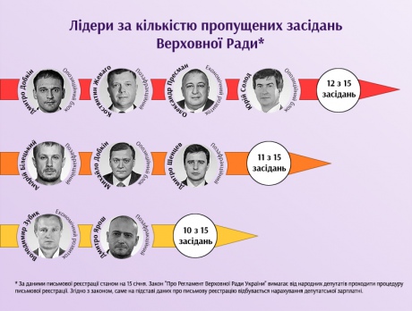По данным письменной регистрации по состоянию на 15 января, первое место по количеству пропущенных заседаний Верховной Рады делят четверо депутатов: Дмитрий Добкин и Юрий Солод из "Оппозиционного блока", член "Экономического развития" Александр Пресман и внефракционный депутат Константин Жеваго