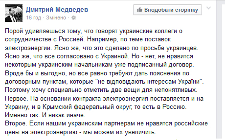 "По контрактам на импорт и экспорт электроэнергии, которые были подписаны украинскими государственными энергетическими компаниями я даю поручение начать служебное расследование относительно деятельности должностных лиц Министерства энергетики и угольной промышленности и руководства государственных компаний при заключении контрактов как на импорт электрической энергии с РФ так и на поставку электричества на украинскую территорию - Автономной республика Крым ", - сказал Яценюк