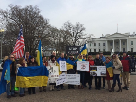 В Вашингтоне под стенами Белого Дома Украинцы провели акцию, где призвали президента США Барака Обаму предоставить Украине военную помощь и усилить санкции против России и таким образом остановить агрессию Путина.