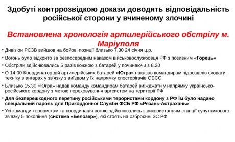 Впоследствии председатель СБУ Валентин Наливайченко сообщил, что первый приказ российским артиллеристам об обстреле Мариуполя поступил от их руководства в 7:30 утра 24 января.