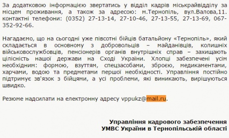 Так, для поступления в киевский батальон милицейского спецназа "Миротворец" желающим предлагают обращаться по адресу [email protected], аналогичный батальон "Тернополь" приглашает добровольцев писать на [email protected], а начальник криминальной милиции УМВД Украины на Приднепровской железной дороги Олег Аржевичев пользуется ящиком с показательной адресу [email protected].